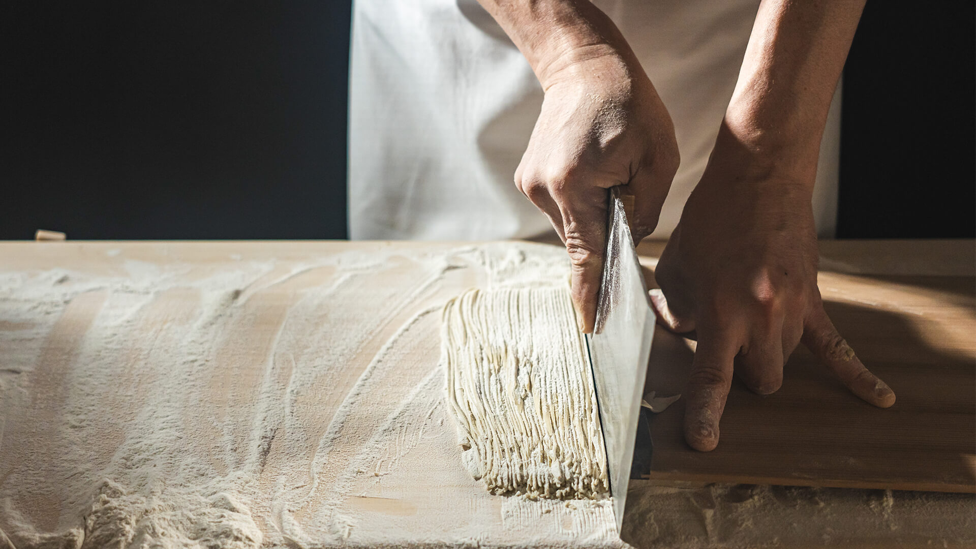 機械打ちでは、強い圧力で生地をのすため、麺が“密”になります。一方、大石の手打ちは時間と力をかけて“のし”をゆっくり行うことで、粉の粒子同士にわずかな隙間=“空気の層”を生み出します。この構造が、後の茹で上がりで香り立ちや、短い茹で時間でのコシを実現します。